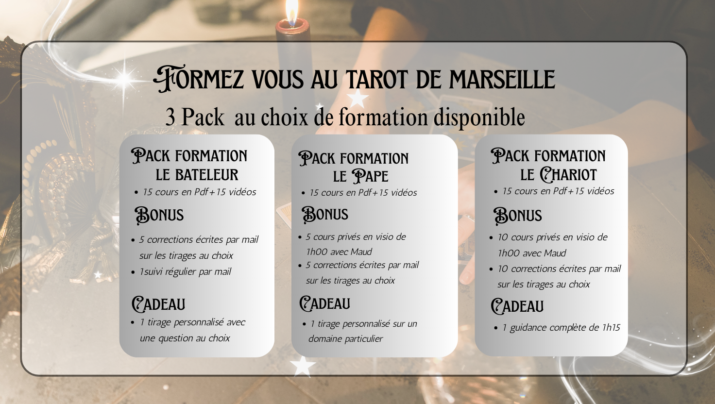 J’ai crée une formation en ligne en 3 formats (Le Bateleur,Le Pape, Le Chariot), pour vous accompagner pas à pas vers la maîtrise du Tarot de Marseille, selon votre rythme et vos besoins.